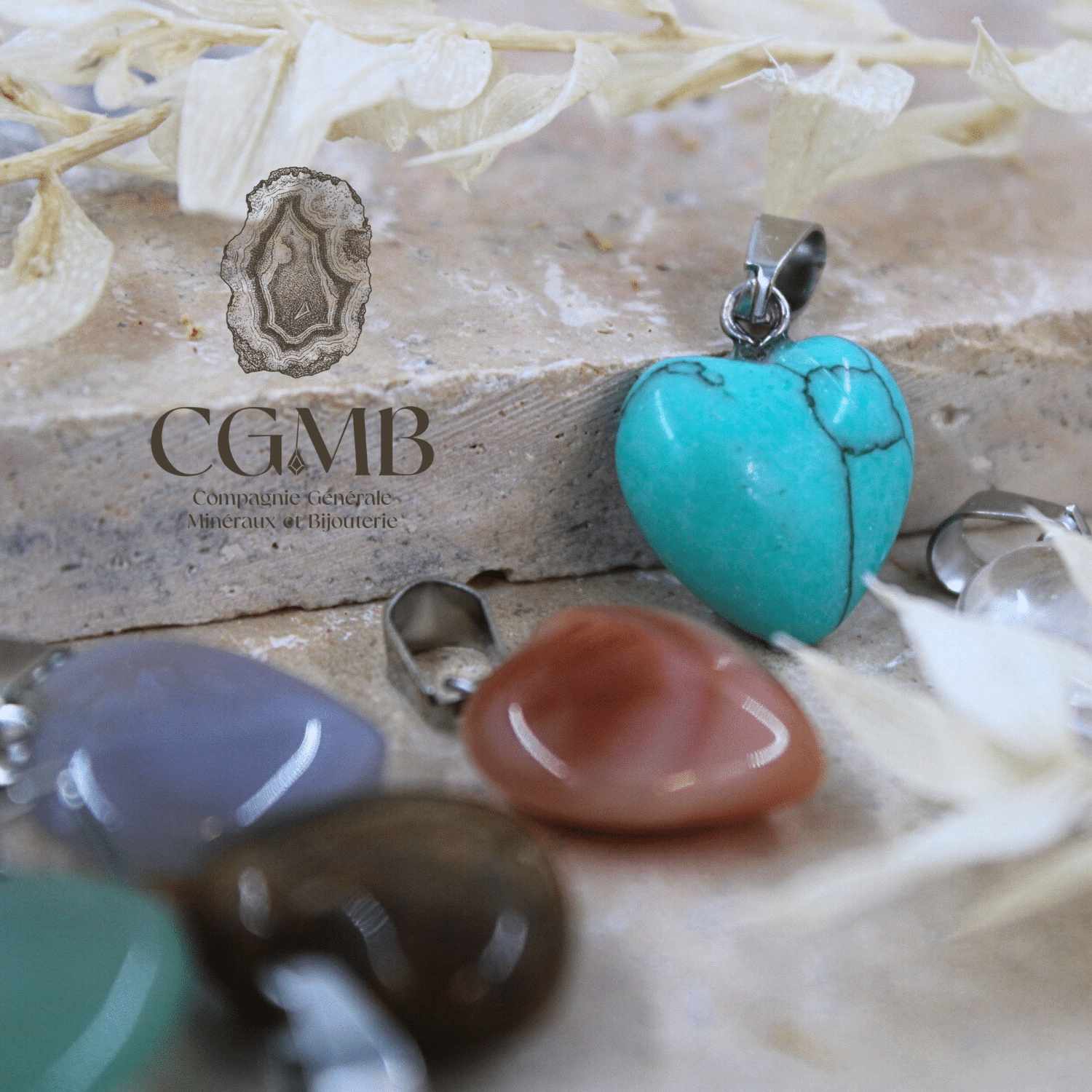 – Quartz rose ; Agate ; Quartz ; Cornaline ; Oeil de tigre ; Howlite teintée ; Aventurine ; Onyx ; Ambre ; Lépidolite ; Fluorine