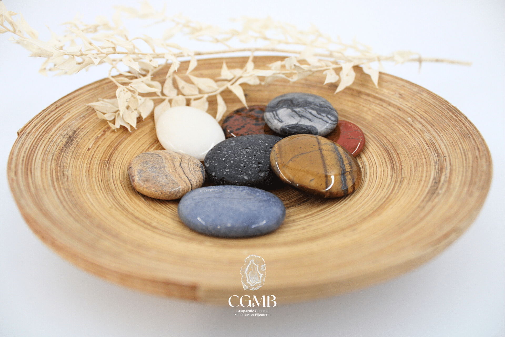 | Sélection | Calcite jaune, Calcite blanche, Onyx, Obsidienne Acajou, Oeil de tigre, Jaspe rouge, Jaspe paysage, Jaspe black picasso, Howlite, Dumortierite, Lave |