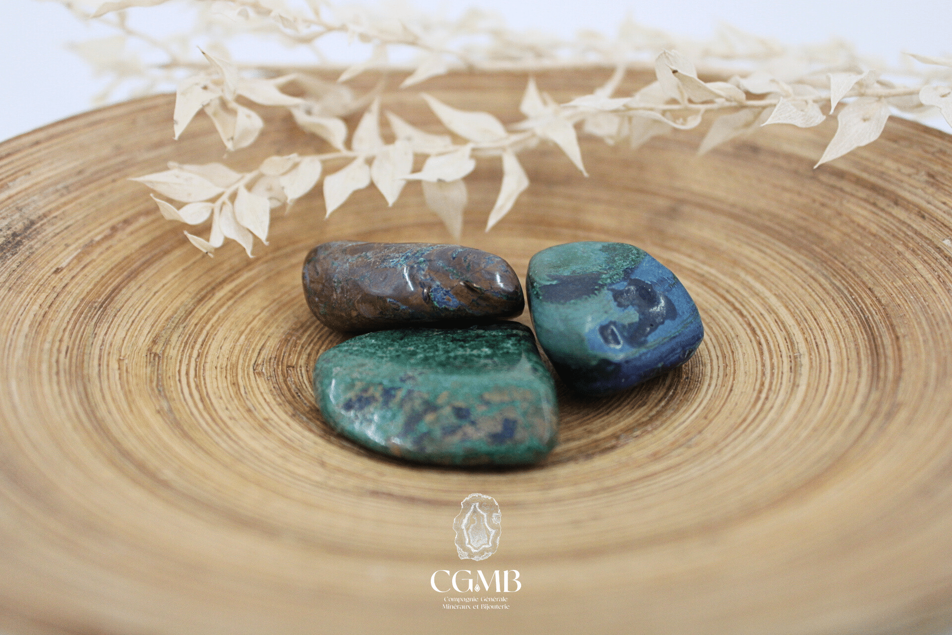 Quantum Quattro – mélanges de 4 cuivres : malachite, shattuckite, chrysocolle et dioptase – polie